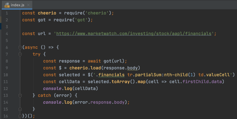 const cheerio = require('cheerio');const got = require('got');const url = 'https://www.marketwatch.com/investing/stock/aapl/financials';(async () => { try { const response = await got(url); const $ = cheerio.load(response.body); const selected = $('.financials tr.partialSum:nth-child(1) td.valueCell'); const cellData = selected.toArray().map(cell => cell.firstChild.data); console.log(cellData); } catch (error) { console.log(error.response.body); }})();